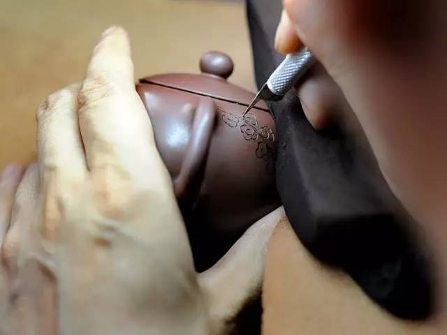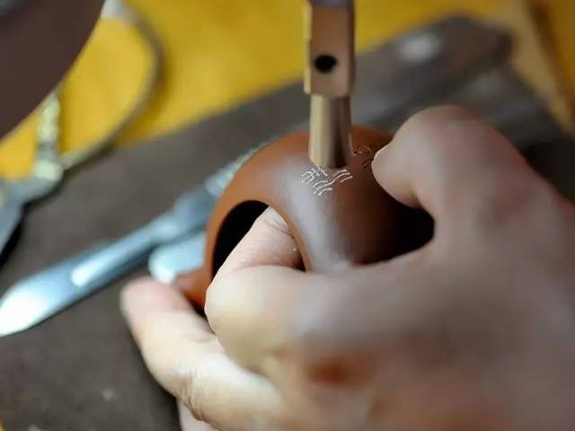 紫砂坯體在未干之前,將圖案紋樣拷貝在坯體上,用刻刀刻出紋樣。所刻紋樣要清晰、挺括、流暢、邊緣光潔,以使嵌金順手自如,雕刻時(shí)還要考慮泥坯成陶后的收縮比率。